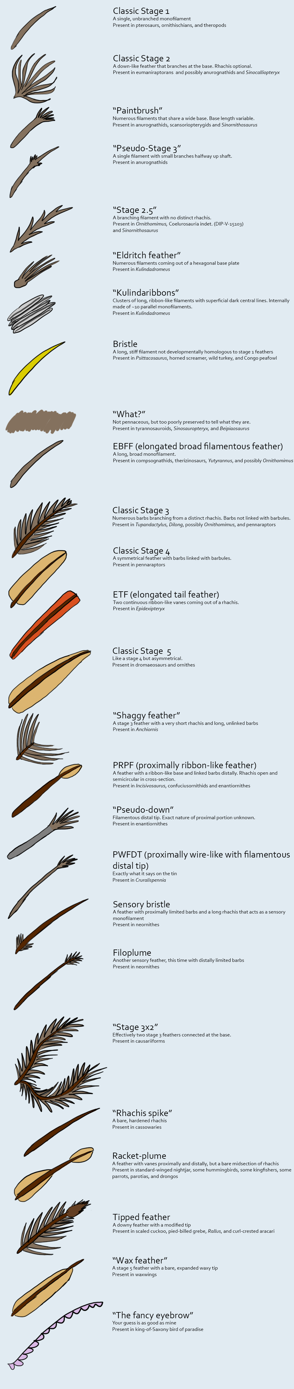 Here are the many varieties of filamentous integument that have evolved in Avemetatarsalia. It's more complex than just the five stages! Quotes denote nicknames I give to filament types that, as far as I know, don't have a widely or technically used name yet. Tan vanes are made of many branching filaments, red vanes are solid.